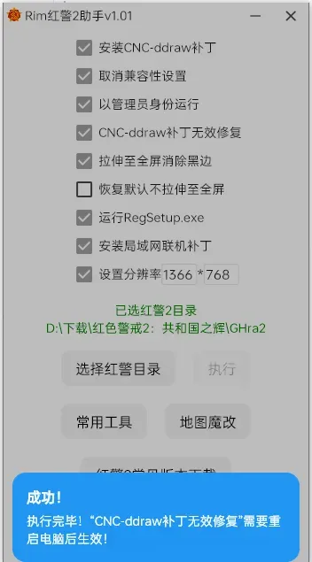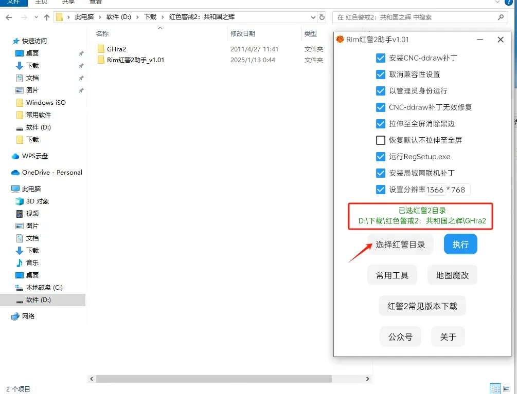 勾选以上选项后,“选择红警目录”,然后点击执行。