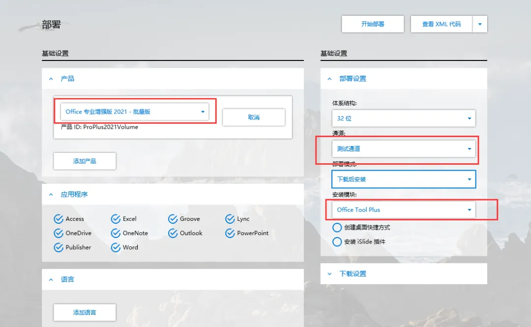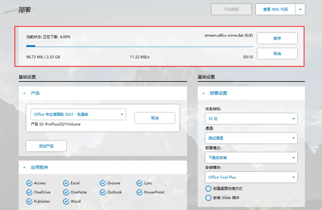 通道如无特殊需求,默认的(当前通道)即可,Office 2019批量版请选择 Office 2019 企业长期版,Office 2021需要选择测试通道。