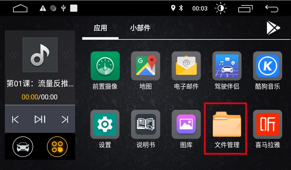 5、 在中控屏上打开文件浏览器,常见的文件浏览器有ES文件浏览器、文件、文件管理等。不同中控屏上的文件浏览器名称与图标并不相同。