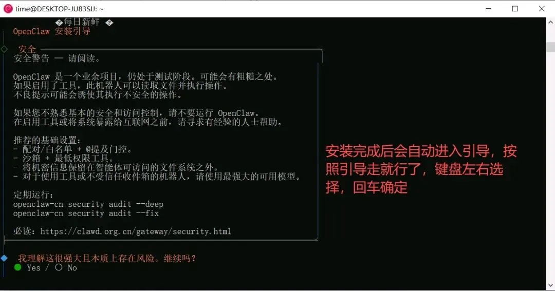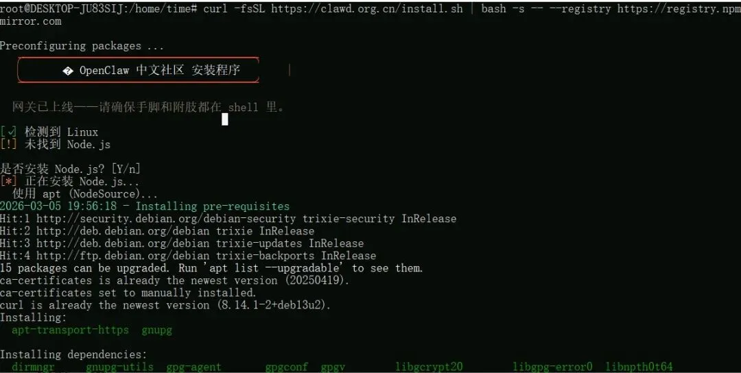 curl -fsSL https://clawd.org.cn/install.sh | bash -s -- --registry https://registry.npmmirror.com提示:安装过程耗时较长,耐心等待即可,完成后会自动进入配置引导模式