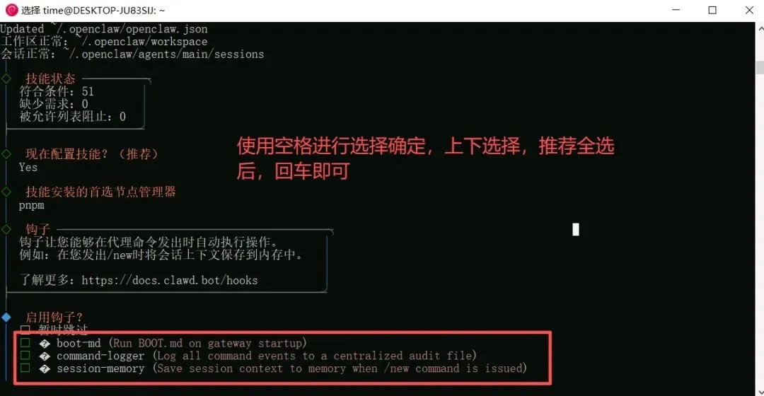 1. 选择:快速开始 → 自定义模型 (兼容 OpenAI/Anthropic) (Bring your own model) 2. 选择:Custom Provider API key (OpenAI/Anthropic 兼容接口) 3. 选择:OpenAI Compatible (Default) 4. 填写 Provider ID:自定义内部名称(如 my-local-llm,用于定位模型)5. 填写 Base URL:模型 API 地址(示例:英伟达地址 https://integrate.api.nvidia.com/v1)6. 填写 Model ID:模型唯一标识(示例: moonshotai/kimi-k2.5)7. 填写 API Key:对应模型的密钥(必填) 8. 选择 All providers:直接按回车键确认 9. 保持当前配置 (time/moonshotai/kimi-k2.5):直接按回车键确认 10. 通道配置: • 可选:Telegram (Bot API)(海外)、飞书(国内推荐); • 拓展:后续若支持企业微信了,可按需到配置文件手动配置。 11. 配置技能:询问「现在配置技能?」时选择 yes 12. 节点管理器:技能安装首选 pnpm(推荐) 13. 钩子选择:根据界面提示按需选择(参考配图)
