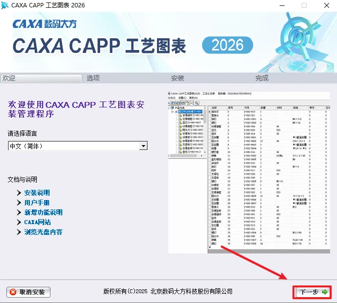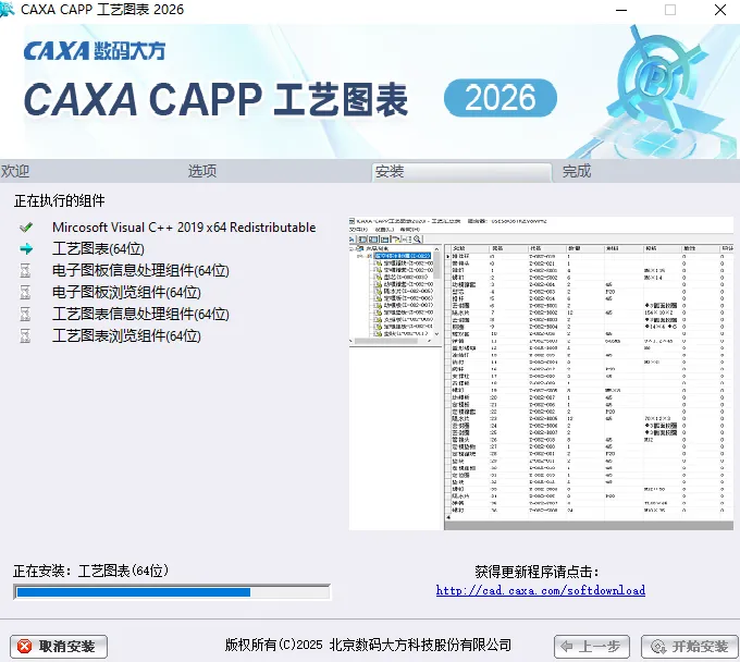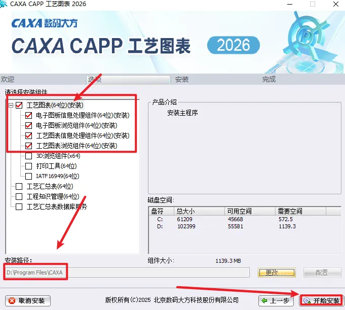 5.勾选“工艺图表”,选择软件安装路径(必须选中工艺图表项),安装路径不要出现中文,勾选其他需要安装的组件,点击“开始安装”
