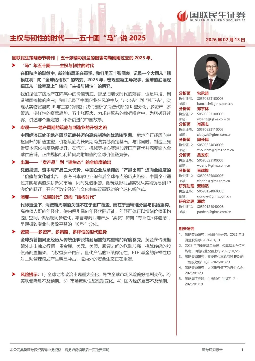 主权与韧性的时代——五十图“马”说(附下载)文章摘要在旧秩序的裂缝中,新的格局正在重塑。我们用五十张图表,记录一个大国从“规模红利”向“全球话语权”的转变。2025 年,宏观重新主导叙事,全球的底层逻辑正从“效率至上”转向“主权与韧性”的博弈。文章内容由于文章篇幅限制,只能分享部分暗号:主权与韧性的时代——五十图“马”说2025-260213-国联民生证券-38页免责声明:以上报告均系本报告通过公开、合法渠道获得,报告版权归原撰写/发布机构所有,如有侵权,请联系作者删除,本报告为推荐阅读,仅供参考学习,不构成投资建议,如对报告内容存疑,请与撰写/发布机构联系。往期推荐2022年智能家居系列研究报告(附下载)2023-02-082022年中国云计算创新活力研究报告(附下载)2023-02-072023跨年科学演讲研究报告(附下载)2023-02-052022年度消费新潜力白皮书(附下载)2023-02-022022年医疗器械年度创新白皮书(附下载)2023-02-012023年中国软件技术发展洞察和趋势预测研究报告(附下载)2023-01-312022年中国式家族办公室行业发展白皮书(附下载)2023-01-302022年区块链赋能农业发展研究报告(附下载)2023-01-292022年中国宽带发展白皮书(附下载)2023-01-272023年美妆和家清产品消费者洞察研究报告(附下载)2023-01-25点个在看你最好看