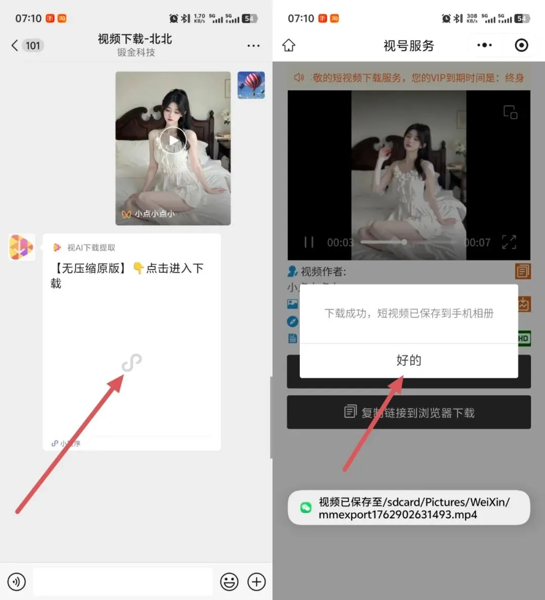 机器人秒速解析视频链接 → 自动返回下载小程序 → 点击进入小程序 → 一键保存到手机相册