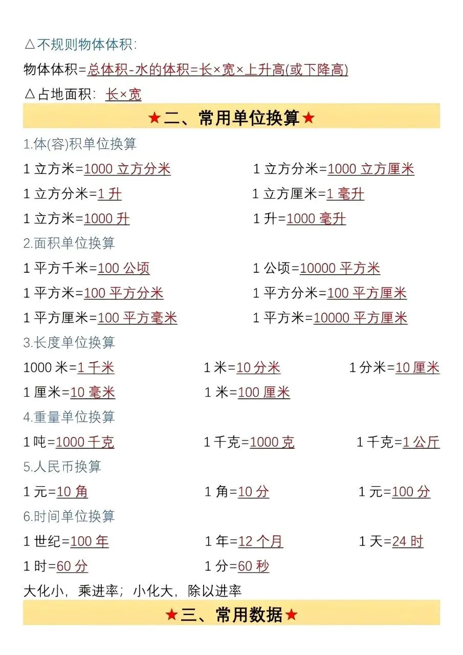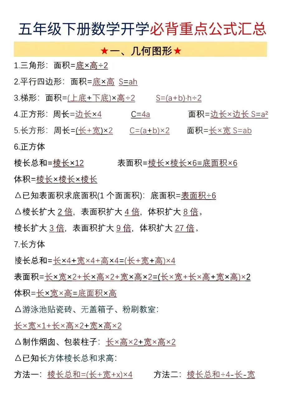 五年级下册数学|必背重点公式汇总(高清下载打印)小学资料每日更新,具体看完整PDF版本(温馨提示:文末👇有完整电子版下载🔗)新版五年级下册数学必背重点公式汇总△因篇幅有限,只展示部分资料截图△↓↓↓领取完整电子版:①:点一点右下角的“👍”和“❤️”,感谢🙏②:在公众号对话框回复:1026资料合集:👇👇小学学习方法五年级下册语文五年级下册英语