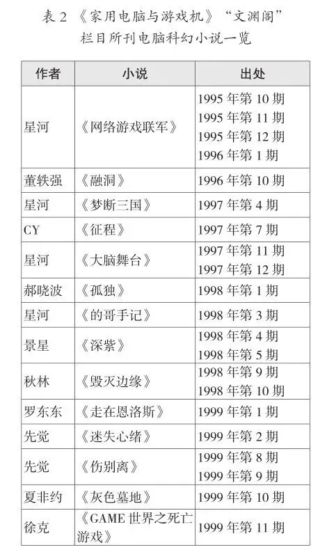 在以游戏介绍、电脑普及为主的《家用电脑与游戏机》上,“文渊阁”无疑是一个异类栏目。1995—2000年,“文渊阁”几易编辑,栏目定位与收稿范围也一再发生变化。这个栏目设立于1995年第2期,副标题为“世界优秀科幻小说”,当期刊发罗迪·卢克《小精灵》的汉译,初任编辑为乐水18。乐水对“文渊阁”栏目的初期定位是收录与电脑有关的“科幻小说”,19星河在《家用电脑与游戏机》刊发的绝大部分作品(如《网络游戏联军》《梦断三国》《大脑舞台》)都出现在这一时期。1997年12月,乐水宣布改版“文渊阁”栏目,除科幻小说外,还收录“与电脑有关的文艺作品”20,吸纳关于电脑使用、电脑游戏对家庭成员的影响等记事文章,科幻作品数量减少。1998年5—10月,由于杂志社人员变动,“文渊阁”进入了暂时的“低沉阶段”21。1998年11月,新编辑石子22成为“文渊阁”的负责人。1999年1月,石子在“编读往来”栏目中详细阐述了自己对“文渊阁”收稿的新要求,即“游戏与文学两种艺术的有机结合,技术与文化之间的交融渗透”,“只要是与电脑、游戏有关的文章……科幻、神话、演义、寓言”23都可以收录。在石子的主持下,1999—2000年间,“文渊阁”主要刊发既有游戏衍生的幻想文学,包括《迷失心绪》《伤别离》《帝国时代狂想曲》等。2001年,《家用电脑与游戏机》编辑部整理90年代“文渊阁”刊发的优秀作品,并将其收录于《中国游戏文学作品精选》。2002年,随着《家用电脑与游戏》改版,“文渊阁”被分解,作为“文学性较强的来稿”加入不同类型的游戏介绍栏目。24