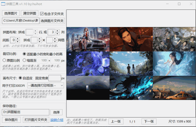 接着设置一下行列数和间距,然后选择裁切比例和画布尺寸,支持拖动调整图片顺序,提供打印功能,支持打印纸张选择。