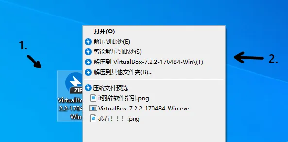 1.点击VirtualBox压缩包,2.右键解压