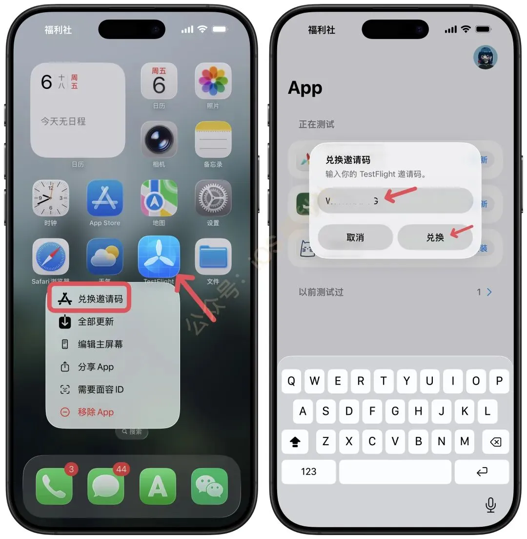 拿到兑换码(一串字母),长按桌面上的TestFlight(如果没有这个APP,自行去AppStore下载)-兑换邀请码-手动输入兑换码-即可自动安装-结束!