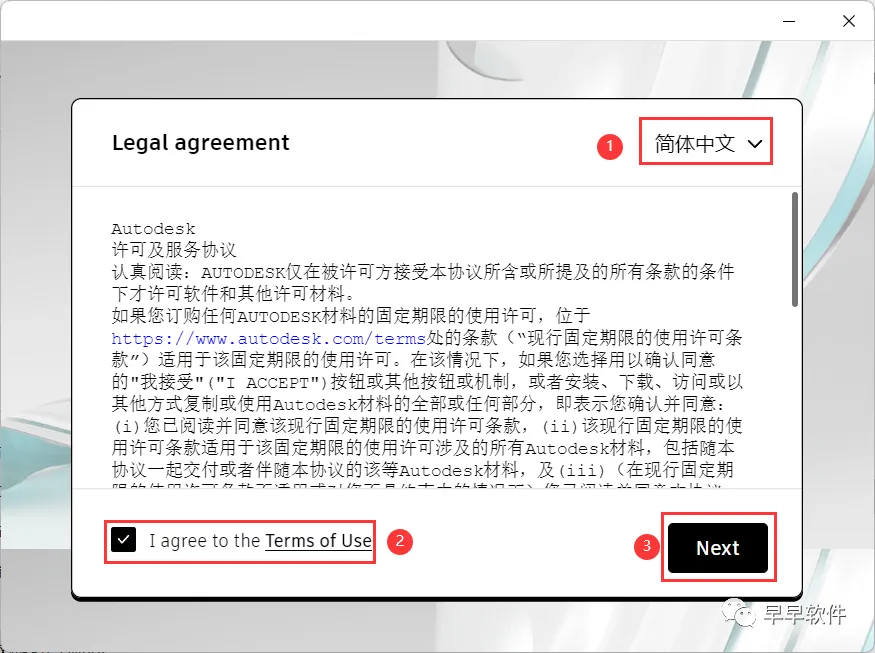 5、语言选择【简体中文】,勾选【我同意】,再点击【Next】