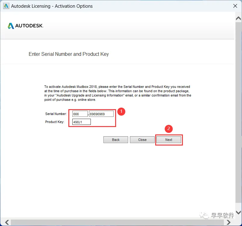 17、Serial Number输入:666-69696969,Product Key输入:498J1,再点击【Next】