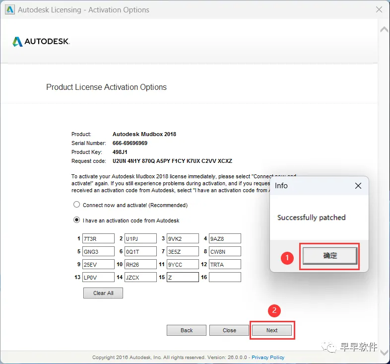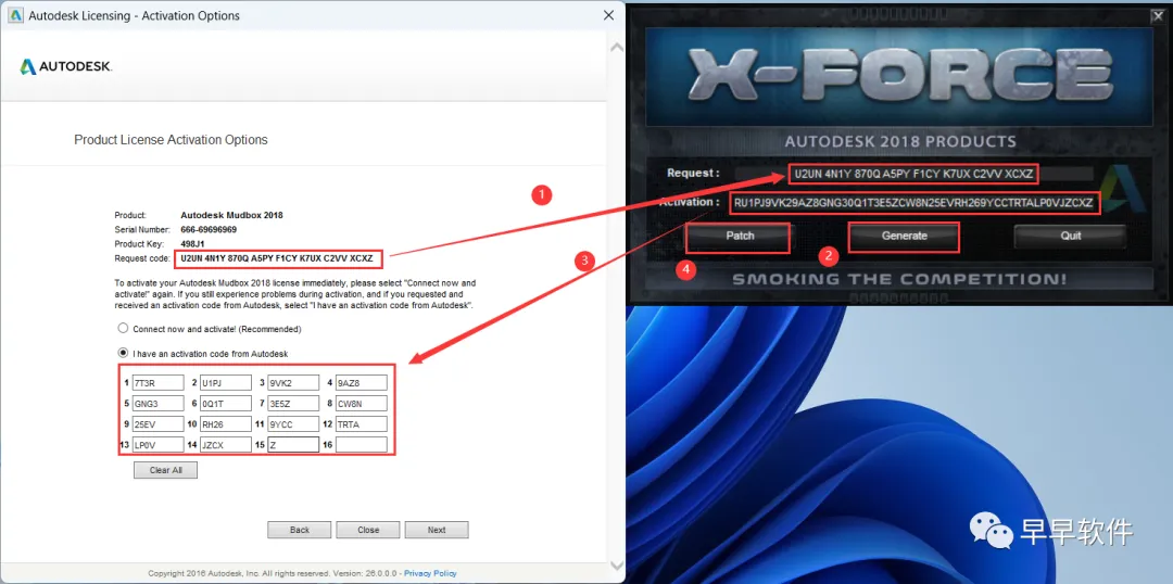 23、打开软件界面,将软件的【Request code】填入到程序的【Requset】内,再点击【Generate】,将程序的【Activation】填入到软件的【I have an…】内,再点击【Patch】