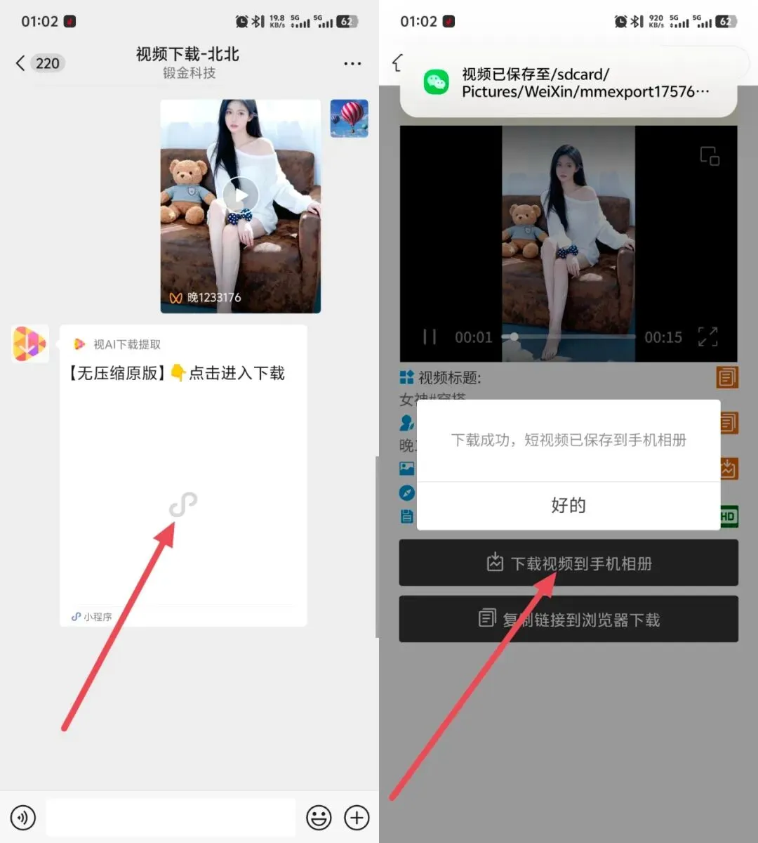 「视频下载机器人」让 视频号视频下载提取 变得前所未有的简单!只需以下两步操作,您就可以轻松将心仪的视频保存到手机。