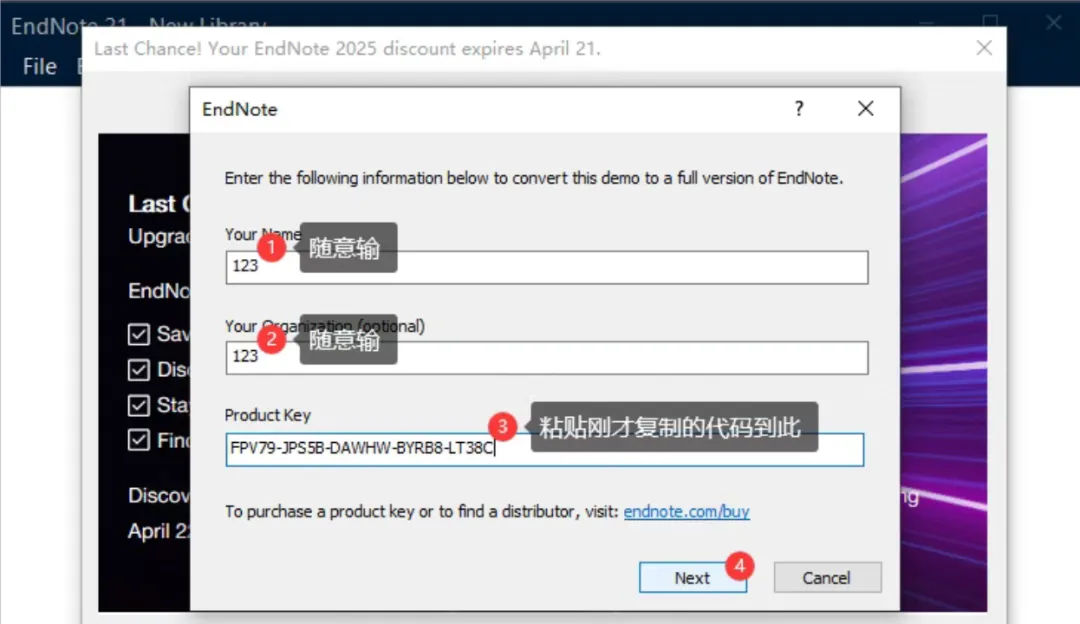 断开网络:关闭Wi-Fi或拔掉网线,确保电脑离线。 运行注册机: 返回解压的安装包文件夹,找到 Crack或Keygen文件夹,右键以管理员身份运行Crack.exe或Keygen.exe。点击 Generate生成激活码,再点击Copy复制密钥。首次启动软件: 从开始菜单运行“EndNote”。 弹出激活窗口时,粘贴刚才复制的激活码,点击“Next”。 再次勾选“I accept the license agreement”,点击“Next”。 创建新库: 选择 “Create a new library”,选择保存位置(建议非系统盘,如 D:\My EndNote Library),点击“保存”。完成激活:进入软件主界面,即表示软件已成功永久激活。