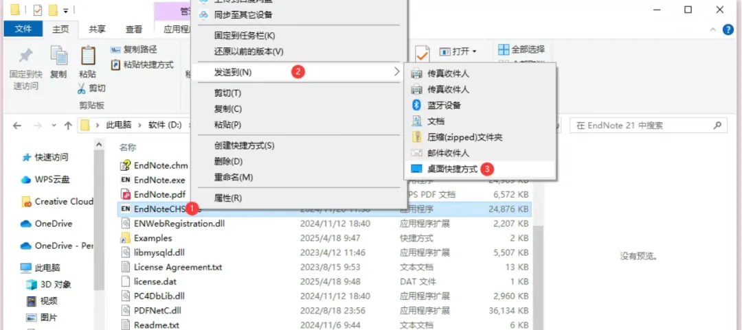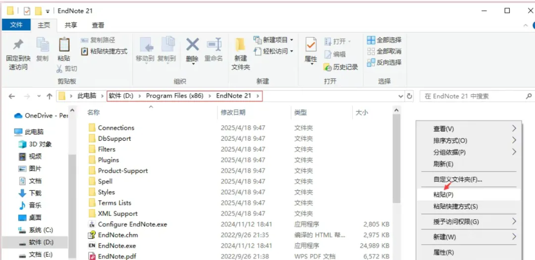 25.然后进入 D:\Program Files (x86)\EndNote 21,鼠标右击空白处选择 粘贴