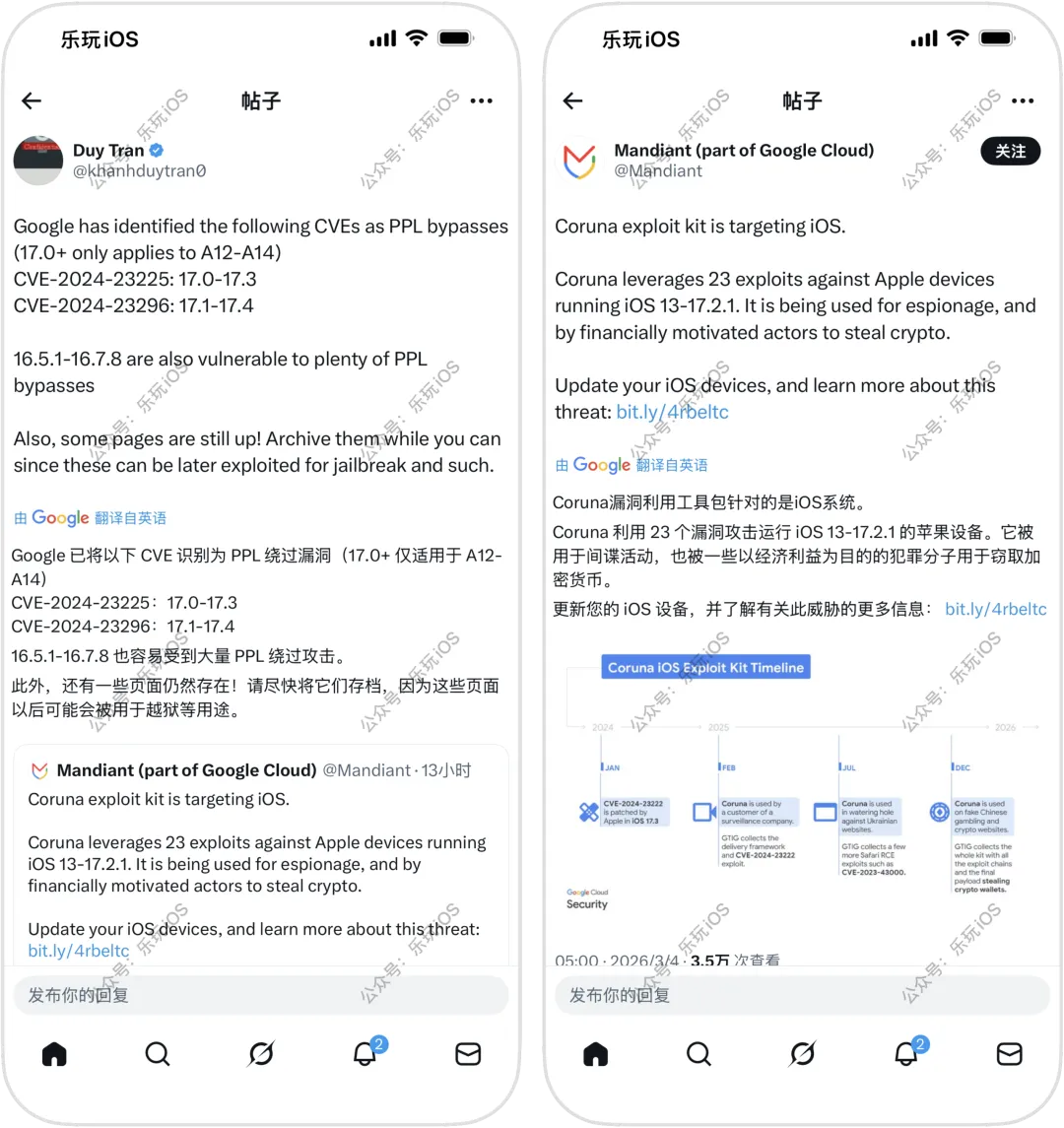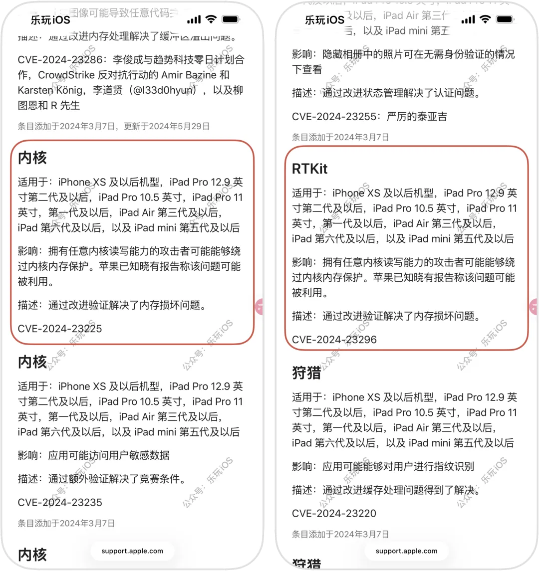 iOS 17 巨魔越狱或有点戏,PPL 漏洞!近日,开发者大佬 Duy Tran 在社媒X上发文称:“Google 已将以下CVE识别为PPL绕过漏洞(17.0+仅适用于A12-A14)16.5.1-16.7.8也容易受到大量PPL绕过攻击。此外,还有一些页面仍然存在!请尽快将它们存档,因为这些页面以后可能会被用于越狱等用途”根据苹果安全文档来看,CVE-2024-23225以及CVE-2024-23296这两个漏洞主要是可以实现绕过内核内存保护结合以上信息,总结下来自大佬Michael 的观点:1、该链式工具包利用的漏洞已在 16.7.6/17.5 版本中全部修复,最后一个内核漏洞也已在 16.7.5/17.2.1 版本中修复2、PPL绕过漏洞适用于A12-A14设备(iPhone XS-iPhone 12)的iOS 17+ 系统3、不过似乎也适用于SPTM设备(A15-A17),可能适用于所有 17.0-17.2.1 版本的设备4、如果存在足够多的漏洞,基于WebKit 越狱实现 TrollStore安装可能可行,即可能实现网页安装巨魔的方法,但仅针对 iOS 17.0 及更低版本,不过能越狱的话,也可能实现安装越狱版巨魔5、当前仅是有了PPL漏洞绕过消息,目前已有研究,但离真正的越狱还远,只能说有了希望▽ 点击下方进入玩机库 ▽