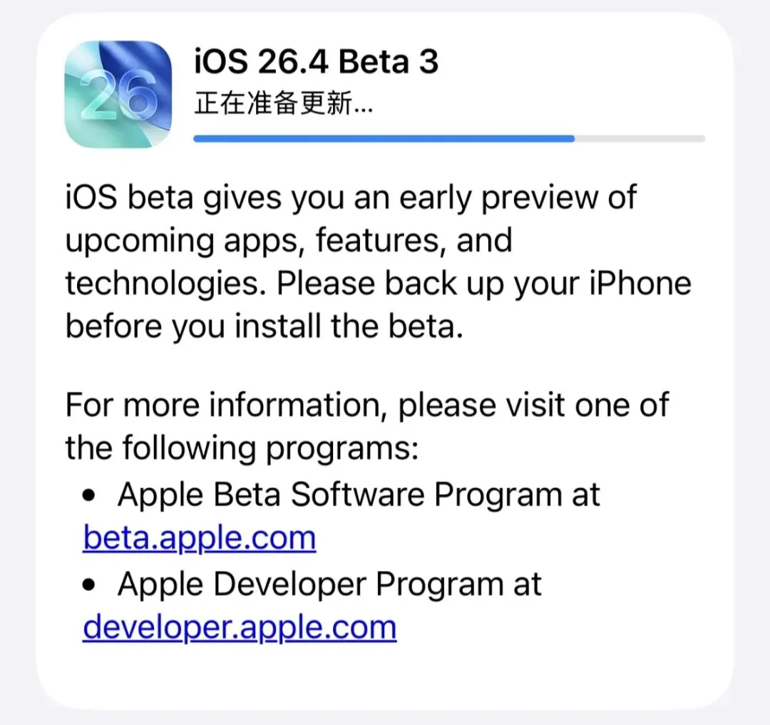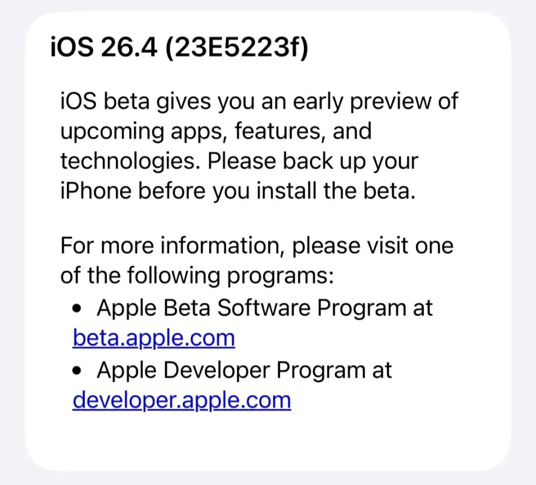 今日凌晨,苹果意外的向广大参与“开发者计划”的用户推送了全新的iOS26.4Beta3版本,不知道的用户以为是不是苹果推送错了呢~因为早在一周之后,苹果就已经推送了iOS26.4Beta3版本。不过经过确认,此次更新与一周前推送的iOS26.4Beta3版本,存在差异,此次更新的版本号为23E5223k,而此前更新的iOS26.4Beta3版本号为23E5223f,由此可见,是同一Beta3中不同的子版本。