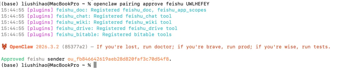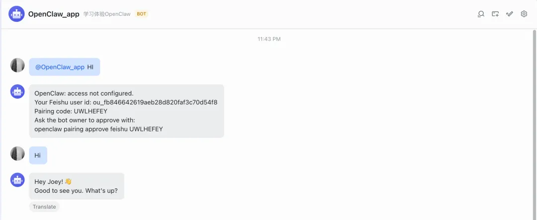 在飞书群中 @机器人发送消息测试, 会收到 AI 回复请求配对。 直接执行配对命令即可完成接入。