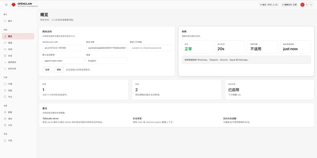 如果控制面板能正常加载,说明 Gateway 已准备就绪!