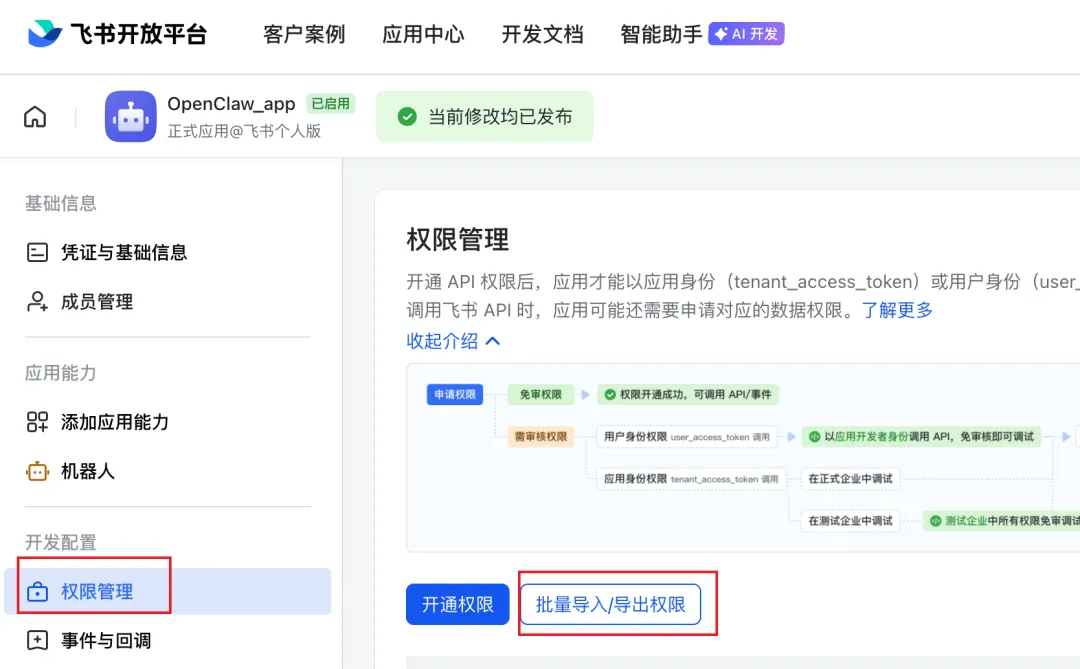 进入权限管理页面,点击批量导入,粘贴以下权限配置: