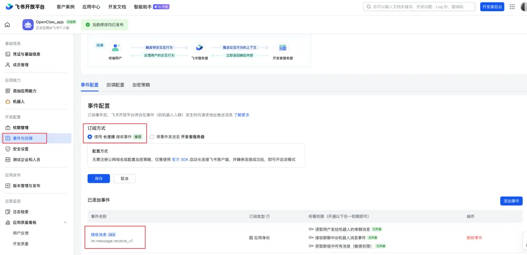订阅方式选择使用长连接接收事件(WebSocket 模式) 添加事件:接收消息 v2.0 im.message.receive_v1