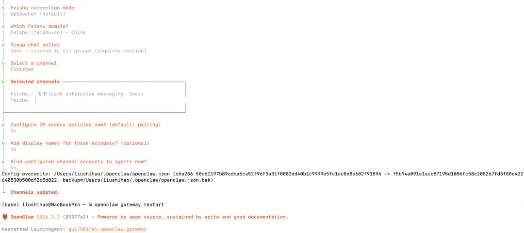 已在 OpenClaw 中运行 openclaw channels add添加飞书通道Gateway 正在运行( openclaw gateway status)