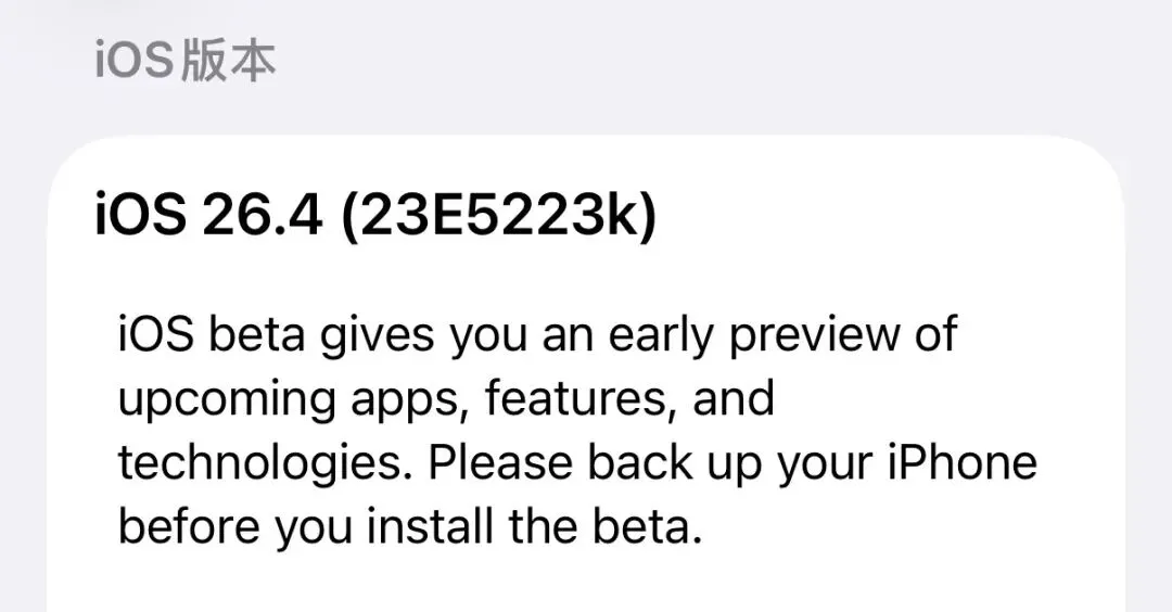 紧急更新,iOS 26.4 新版本发布!前几天苹果才推送了 iOS 26.4 Beta 3,现在非常意外又紧急推送了:iOS 26.4 Beta 3 v.2 更新后版本号由 23E5223f 改成了 23E5223k,更新日志没有显示更新内容。苹果这次紧急推送的 iOS 26.4 Beta 3 v.2 就是一个修复以及兼容性的小更新,尤其是 iPadOS 26.4 Beta 3 v.2 应该主要就是兼容了刚发布了新款 Studio Display 和 Studio Display XDR。除了最新的 iOS 26.4 Beta 3 修复版,苹果这次还为参与了公测计划的用户推送了:iOS 26.4 Beta 2 公测版的版本号与 iOS 26.4 Beta 3 v.2 开发者预览版版本号一致,都是 23E5223k,更新内容也是一样的。目前 iOS 26.4 Beta 主要有以下更新内容:■Apple Store 界面搜索按钮和位置调整;■Apple Music 重新设计专辑和播放列表外观;