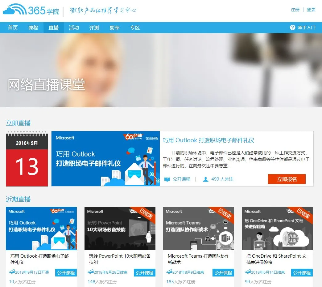 这是微软中国产品组制作的学习中心网站,通过课程直播等方式邀请 Office 大咖免费分享 Office 365 产品的使用技巧,课程全部免费。
