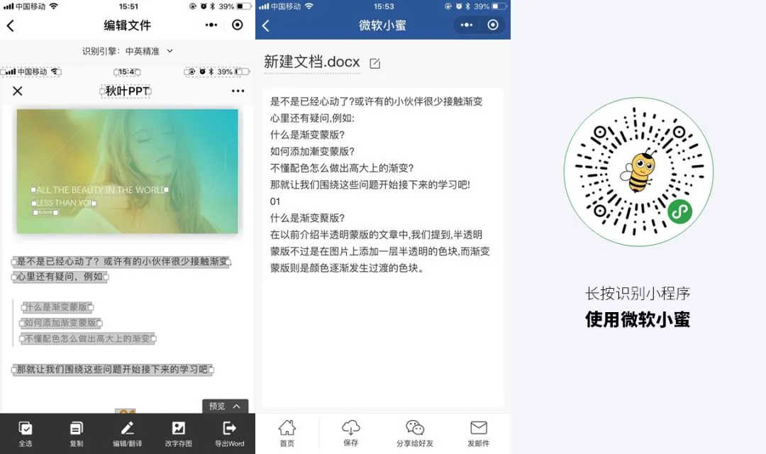 为了方便大家在手机上随时随地使用 Office 产品,微软官方研发了三款微信小程序,帮助你随时创建、传输、保存和分享 Office 文档。