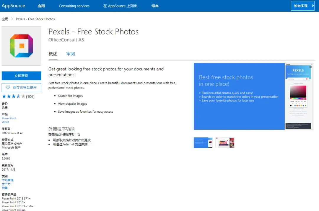 这是微软官方产品加载项库(我们俗称的软件插件库),你可以在这里找到很多能直接安装在 Office 365、Power BI 等产品上的小插件,如 Pexels,安装后你可以直接在 PowerPoint 上使用海量可商用高清精美图片。