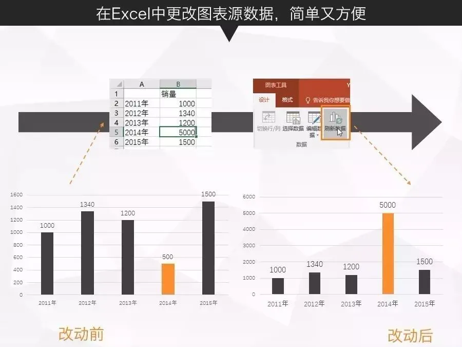 Word和PPT中经常会用到数据图表(饼状图、柱形图、条形图等等),经常一不小心,少敲了个零,怎么办?我们只要从根源入手,在Excel中更改源数据,再在PPT中刷新数据即可~