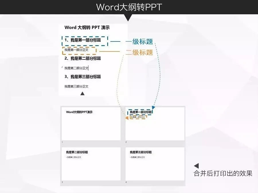 来...本P教你一招:word大纲秒转PPT。在Word中设置好一级和二级标题,然后在PPT中新建幻灯片—幻灯片(从大纲),搞定~