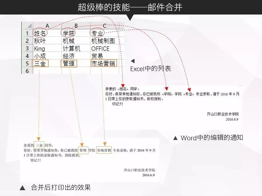 这时候,要着重介绍大杀器:邮件合并,瞬间秒杀1000份通知单,10000份录取通知书。