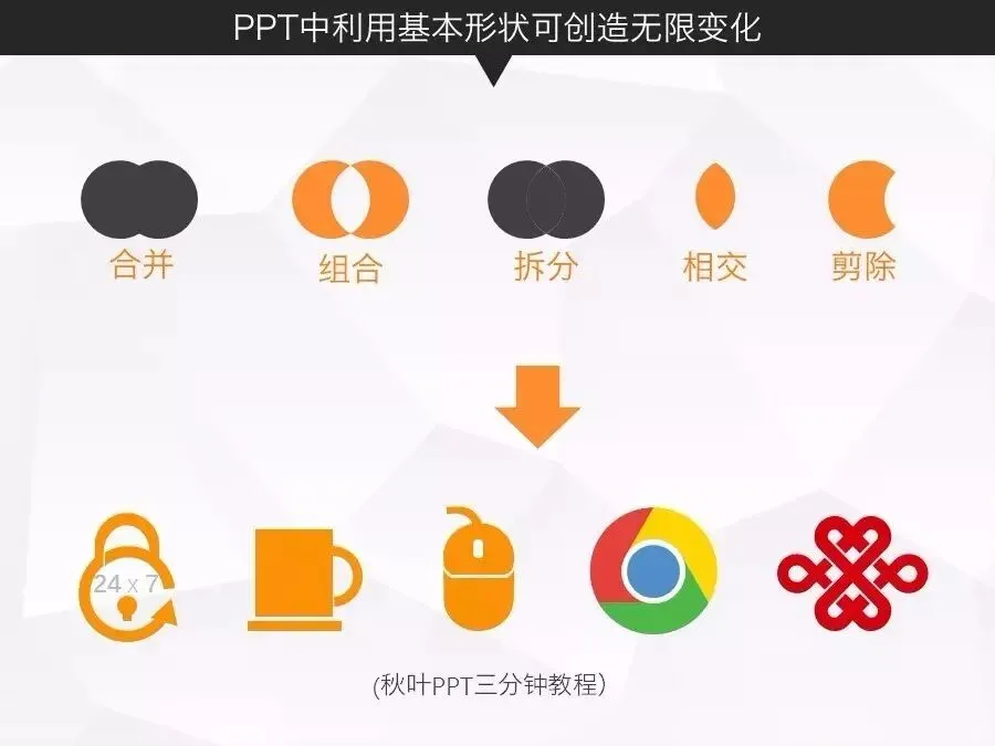 扁平化时代已经来临,看到别人的PPT里都是精美的图标,而你的电脑只有3D小人...通过PPT形状的五种布尔运算,你也可以画ICON了~