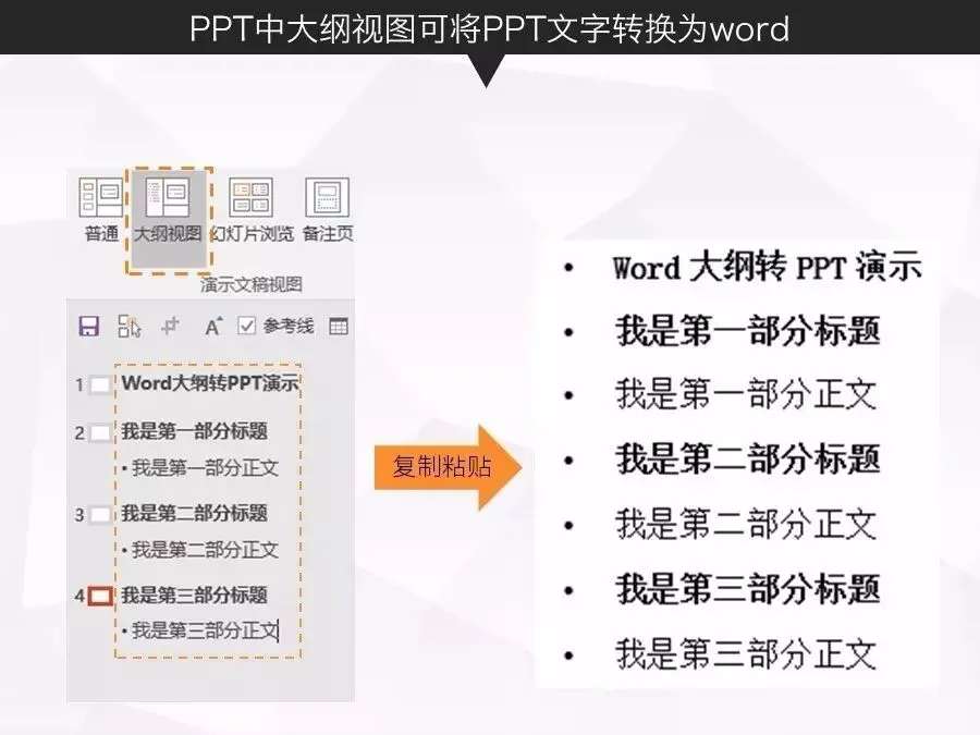 其实没必要这么麻烦啦~进入PPT的大纲视图,复制粘贴进Word~Duang~