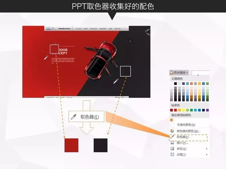 好看的PPT必定要好色~精美的PPT一定是摆脱了系统自带的配色。配色灵感哪里来?我们要学会从好的图片,好看的网站,精美的PPT作品获取配色方案~用什么获取?PPT自带取色器~