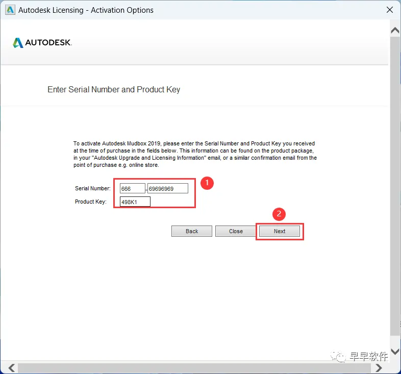 17、Serial Number输入:666-69696969,Product Key输入:498K1,再点击【Next】