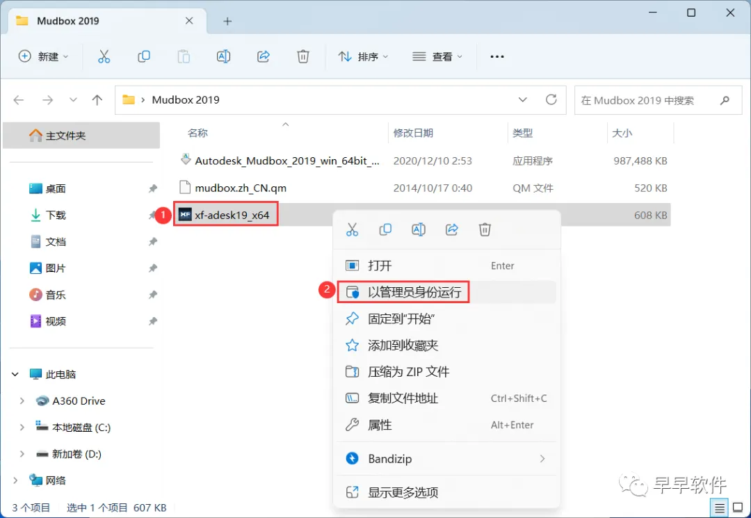 19、回到Mudbox 2019文件夹,找到【xf-adesk19】程序,右键选择【以管理员身份运行】它