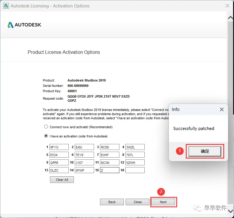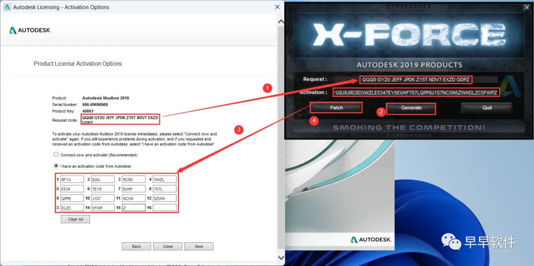 20、打开软件界面,将软件的【Request code】填入到程序的【Requset】内,再点击【Generate】,将程序的【Activation】填入到软件的【I have an…】内,再点击【Patch】
