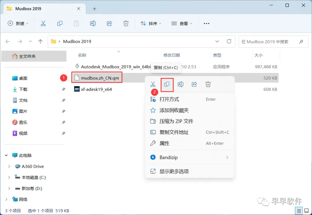 25、回到Mudbox 2019文件夹,找到【mudbox_zh_CN.qm】文件,右键点击【复制按钮】