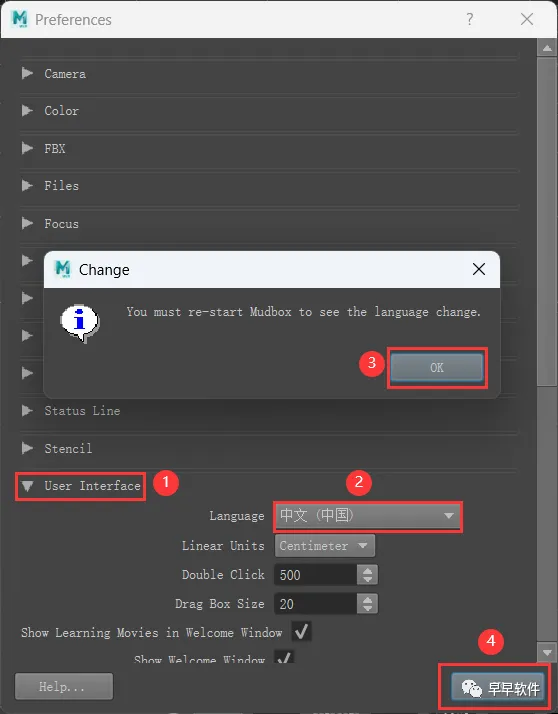 32、依次点击【User Interface】、语言选中【中文】,再点击【OK】,点击【OK】