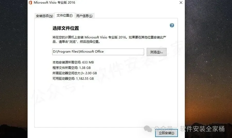 6.点击【文件位置】,然后点击【浏览】设置软件的安装路径,这里我选择直接安装到D盘,你们可自行设置安装路径,设置好安装路径后点击【立即安装】。