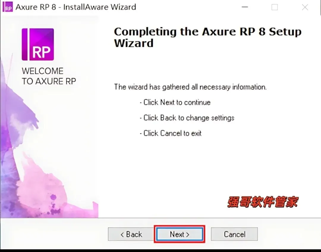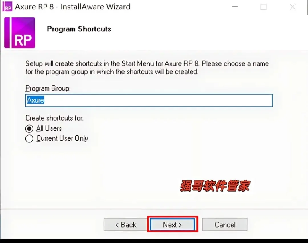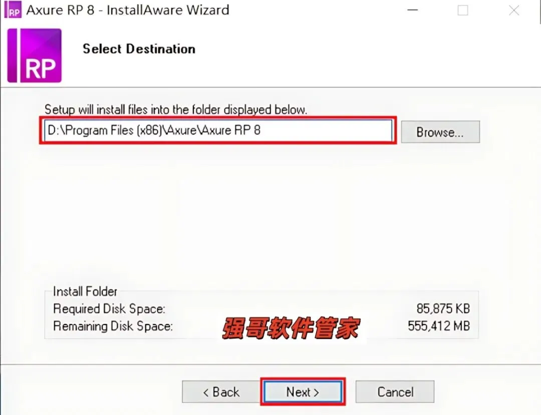 5.点击【Browse】可更改安装位置(建议不要安装在C盘,可以在D盘或其它磁盘下新建一个“Axure RP 8”文件夹。注:安装路径中不能有中文),我这里是直接把“C”改成了“D”。然后点击【Next】