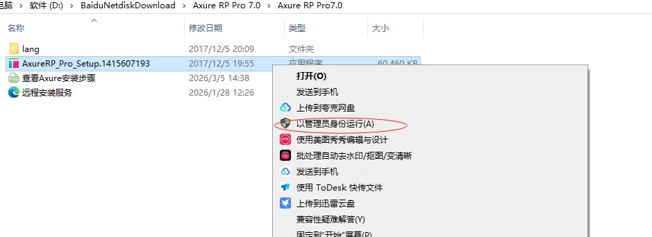 2.找到【Axure RP Pro7.0】文件夹,打开文件夹后,鼠标右击【AxureRP_Pro_Setup.1415607193】选择【以管理员身份运行】。
