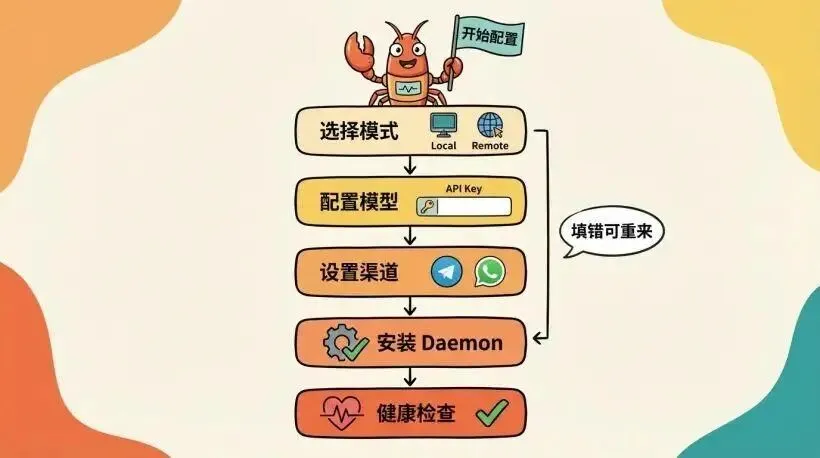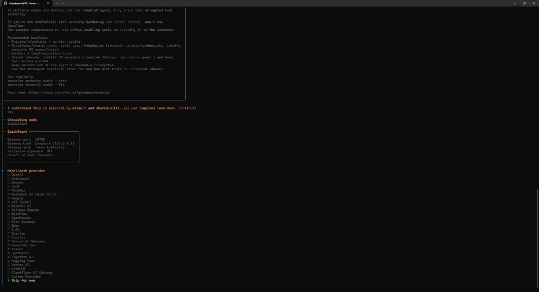 🦞 OpenClaw Installer─────────────────────────────────────Detected platform: linux (WSL2)Node version: v22.1.0 ✓Installing openclaw@latest...✓ Installed successfully安装结束后,会自动进入配置过程,也可以手工运行配置