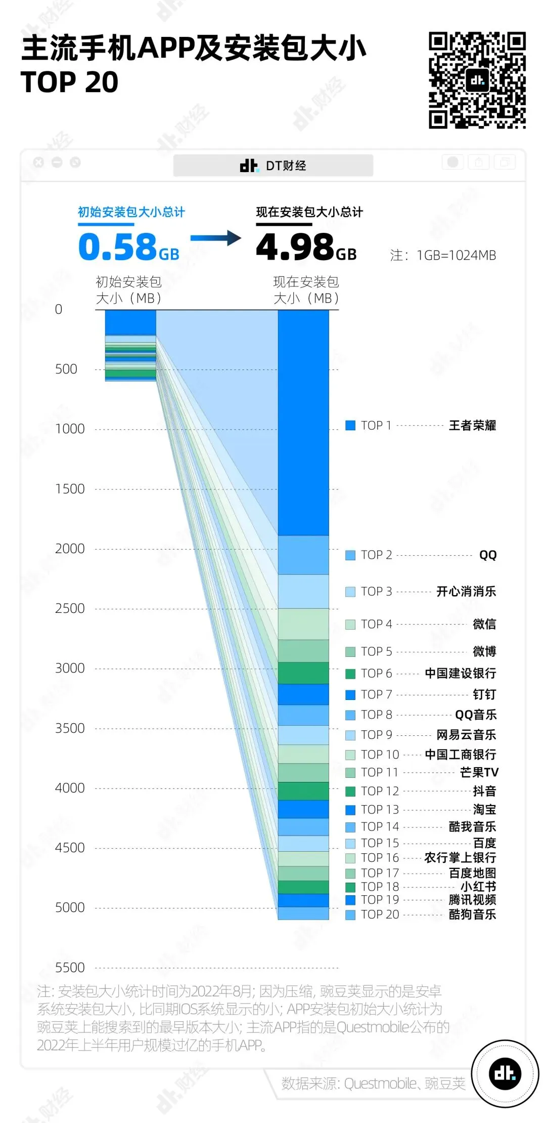 如果只看排名前20的APP,它们的安装包体积和从0.58GB变成了4.98GB,大概是原来的8倍。