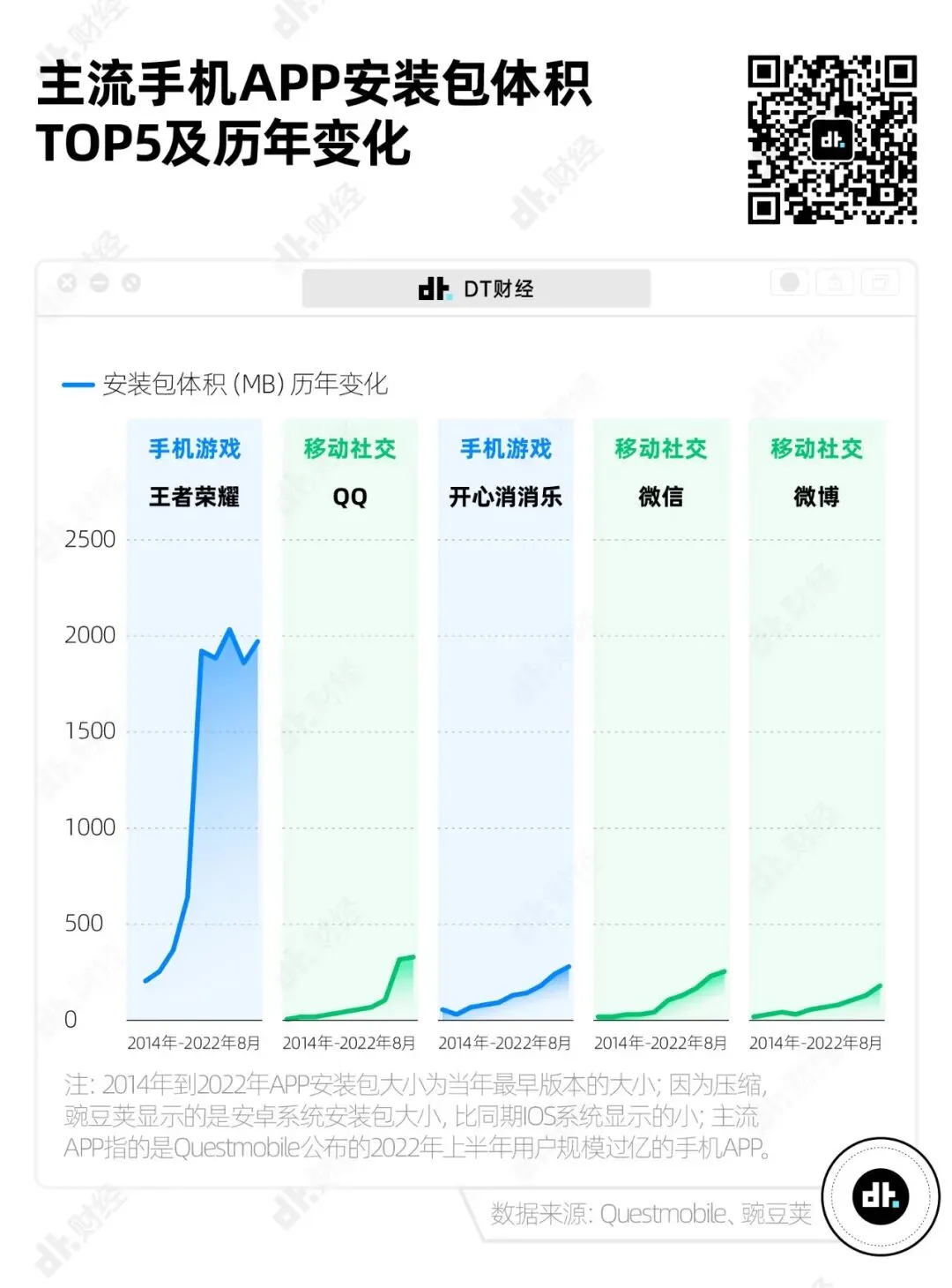 我们首先从中找出安装包大小排名前五的APP,并统计了它们自上线以来历年安装包大小变化。安装包体积大的主要是游戏APP和社交APP。