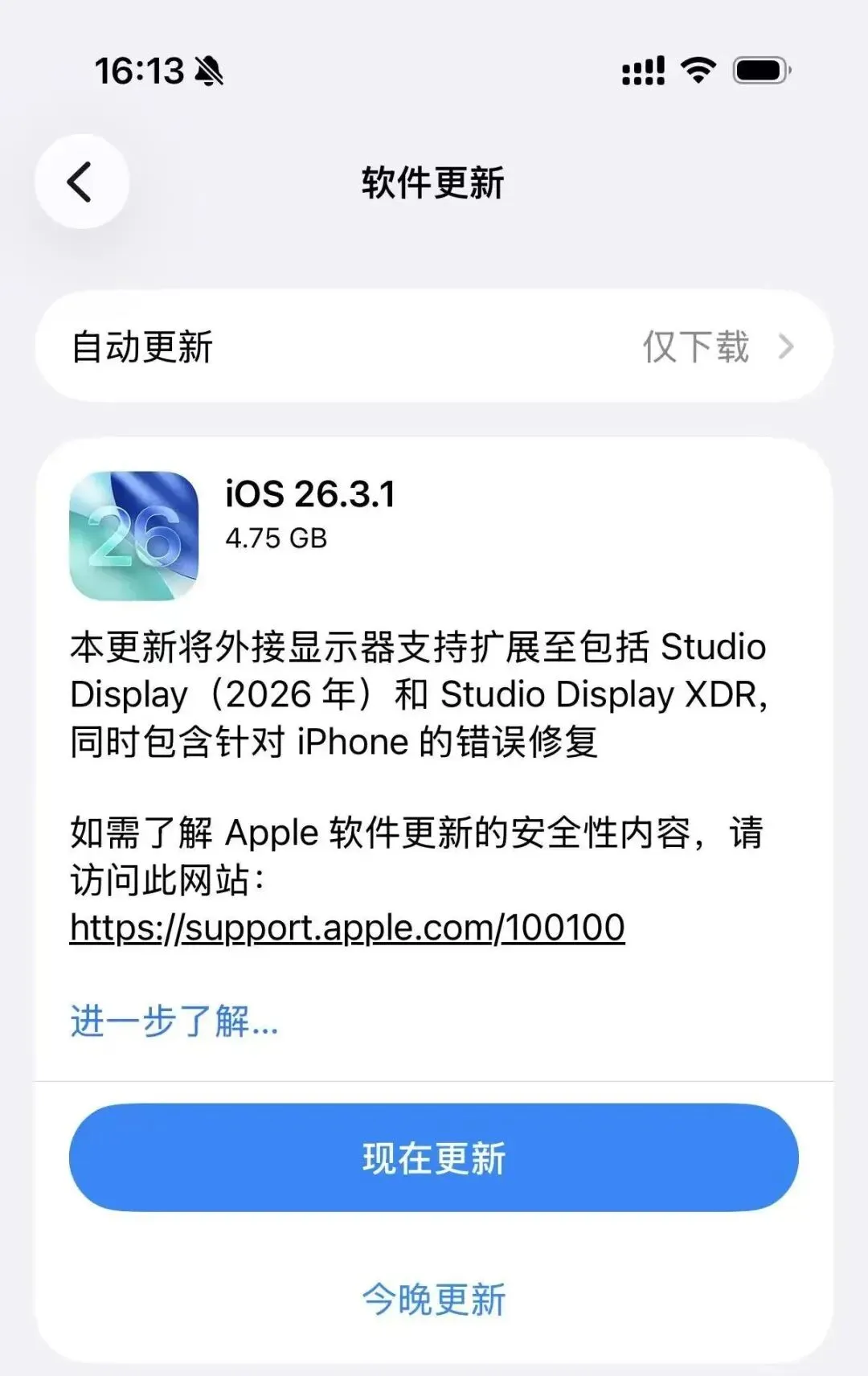 同步更新的iPadOS 26.3.1 /macOS 26.3.1这两个版本没有新增功能,主要是支持新款 Studio Display、Studio Display XDR 显示器,同时修复了部分安全问题。