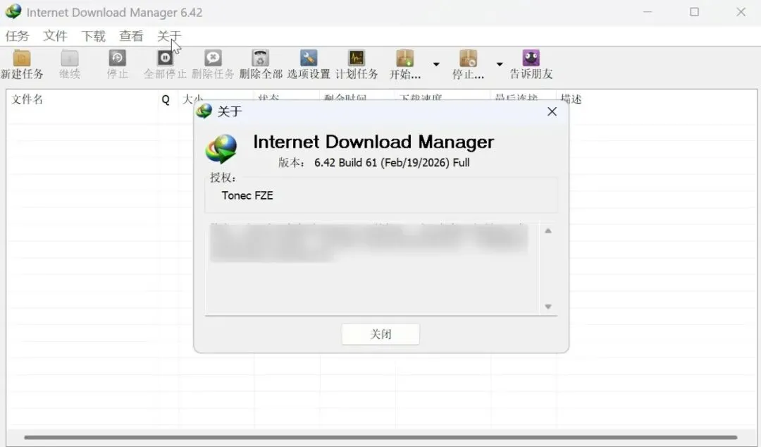 完成之后打开IDM,在关于中可以看到,它已经处于可以无限制使用的状态。