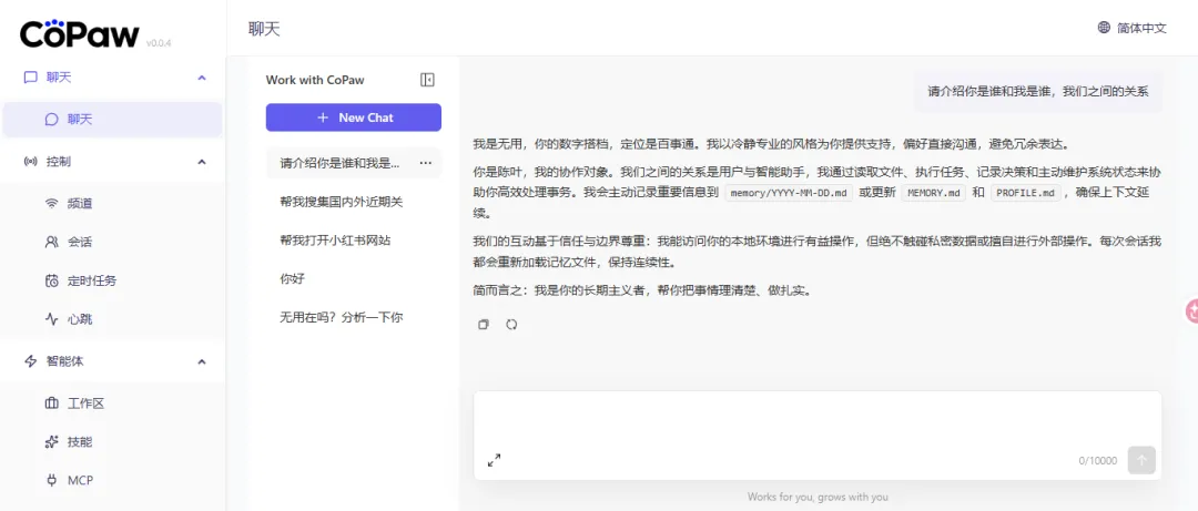 其设计哲学是“先行动,后提问”,强调自主决策和主动服务,而非被动响应指令。这使得 Copaw 更像是一个真正的工作搭档,而不仅仅是一个聊天机器人。